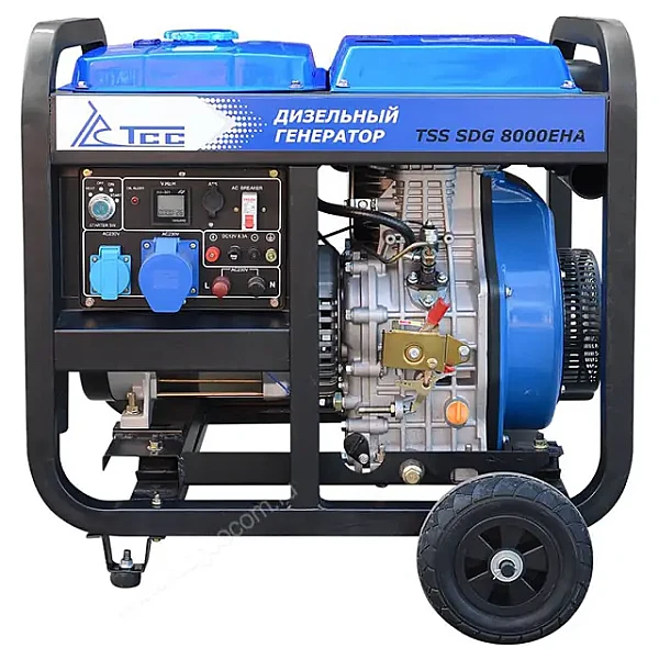 Дизель генератор с электростартом и с разъемом для подключения блока автоматики. TSS SDG 8000EHА предназначен для выработки электроэнергии с основными характеристиками: напряжение - 220 вольт, частота 50 Гц и номинальной мощностью 7,5 кВт, оснащенный колесным комплектом для удобства передвижения.