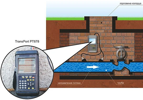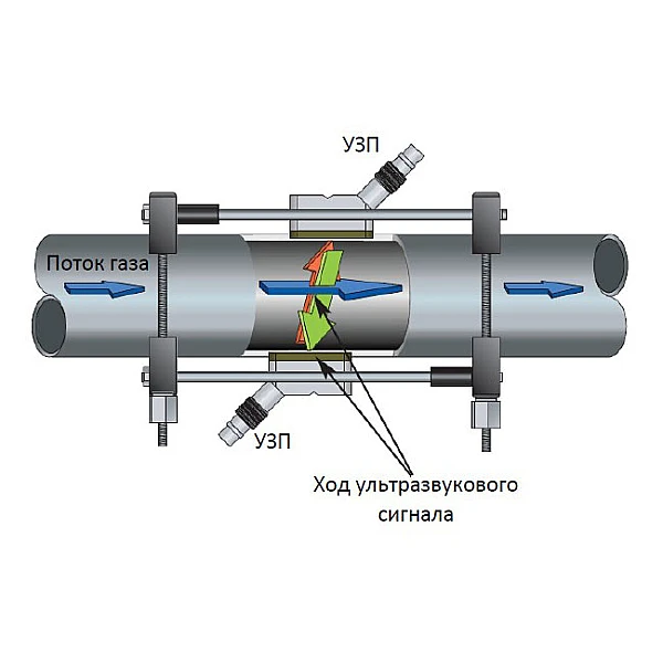 При реализации времяимпульсного метода используется пара УЗП, каждый из которых посылает и принимает кодированные ультразвуковые сигналы, проходящие через измеряемую среду. При течении среды время прохождения сигнала по направлению движения потока меньше, чем время прохождения сигнала против потока; разность этих значений пропорциональна скорости потока. Расходомер TransPort PT878GC измеряет эту разность времен и, используя запрограммированные параметры трубы, определяет расход потока и его направление.