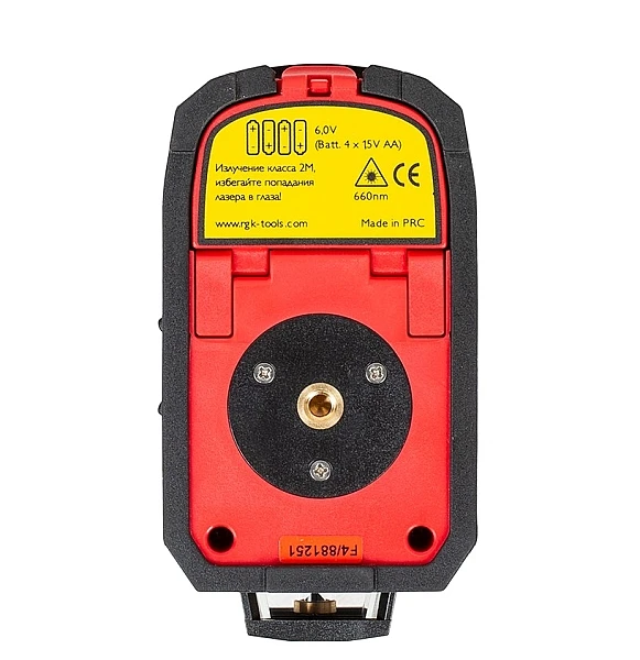 Корпус лазерного нивелира RGK PR-2M прорезинен и обладает уровнем пыле-влагозащиты IP54. Прибор сохраняет работоспособность при попадании песка и мелких водяных брызг. Для установки на штатив и трегер в нижней части корпуса предусмотрено крепление 1/4”.