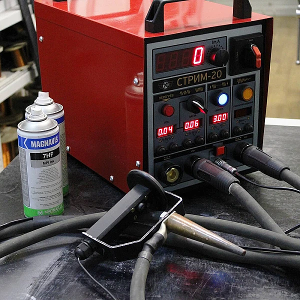 Доступна версия СТРИМ-20A без постоянного тока. Дефектоскоп разработан в соответствии с ГОСТ Р 56512-2015 «Контроль неразрушающий. Магнитопорошковый метод. Типовые технологические процессы» и ГОСТ Р 53700-2009 «Контроль неразрушающий. Магнитопорошковый метод. Часть 3. Оборудование».